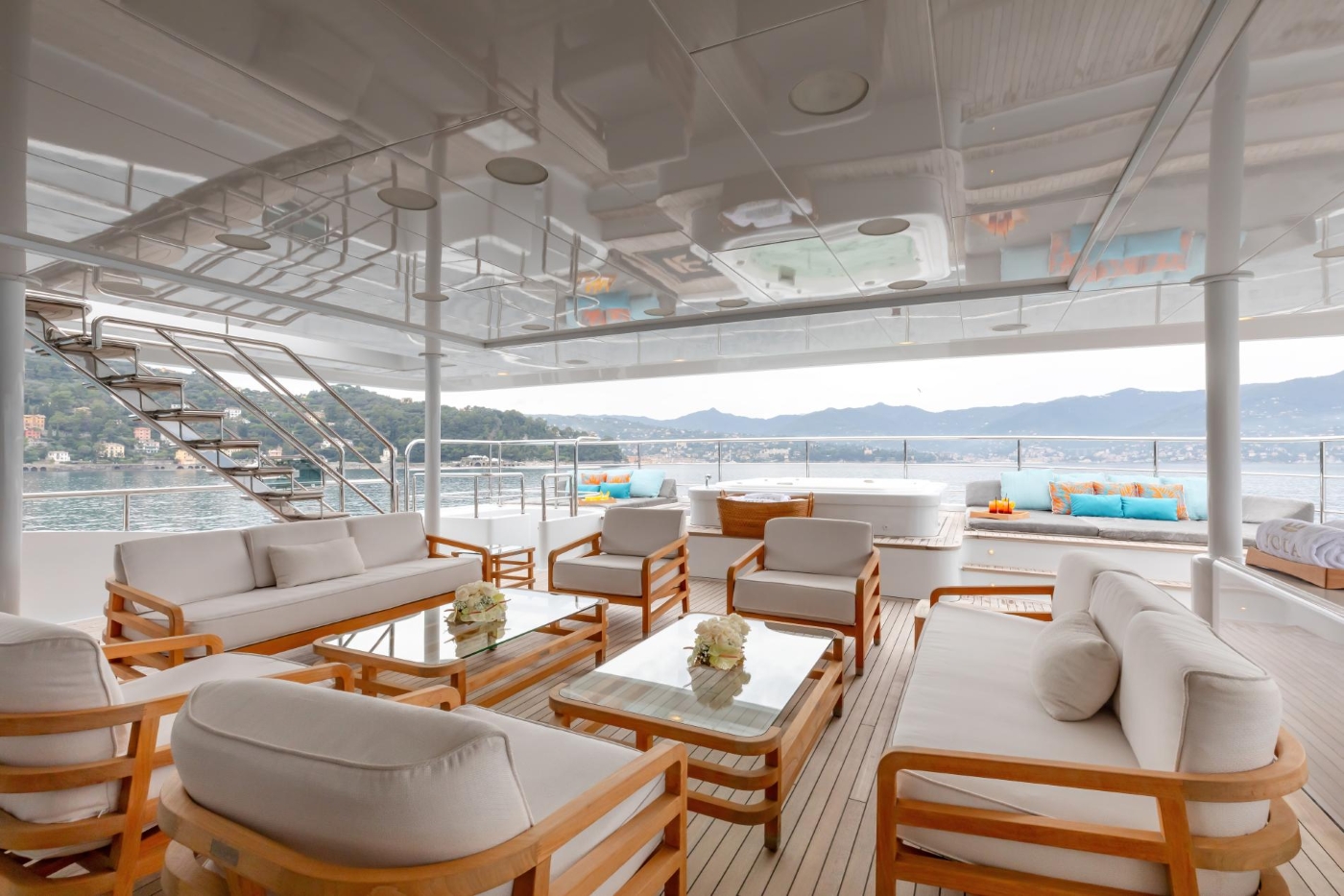 Moving up, the main deck faces a spacious veranda with two areas for relaxation and a piano room with wonderful Steinway grand piano which opens up to the saloon and the dining table able to seat up to 18 people.