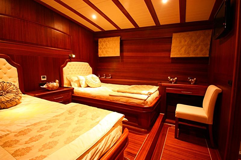 Luxury Gullet ARYF KAPTAN A accommodates up to twelve guests in six cabins. She has two master suites, 2 double cabins and 2 twin cabins, all with ensuite bathrooms, air-conditioning and flat screen televisions.
