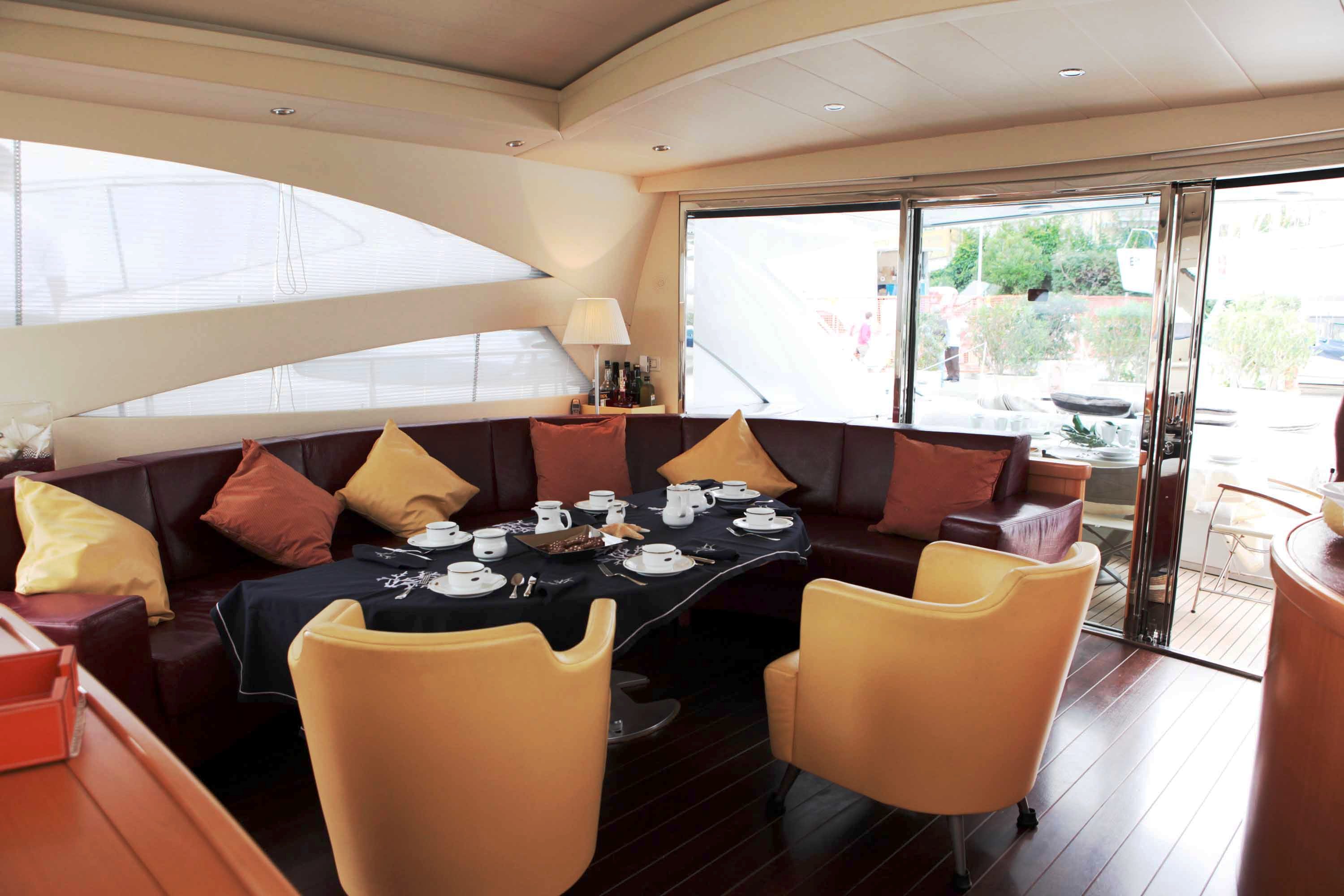 The Pershing motor yacht FIRE FLY has a salon on the main deck that is elegantly furnished with a u shaped Amaranth sofa and two ochre coloured Frau leather armchairs.