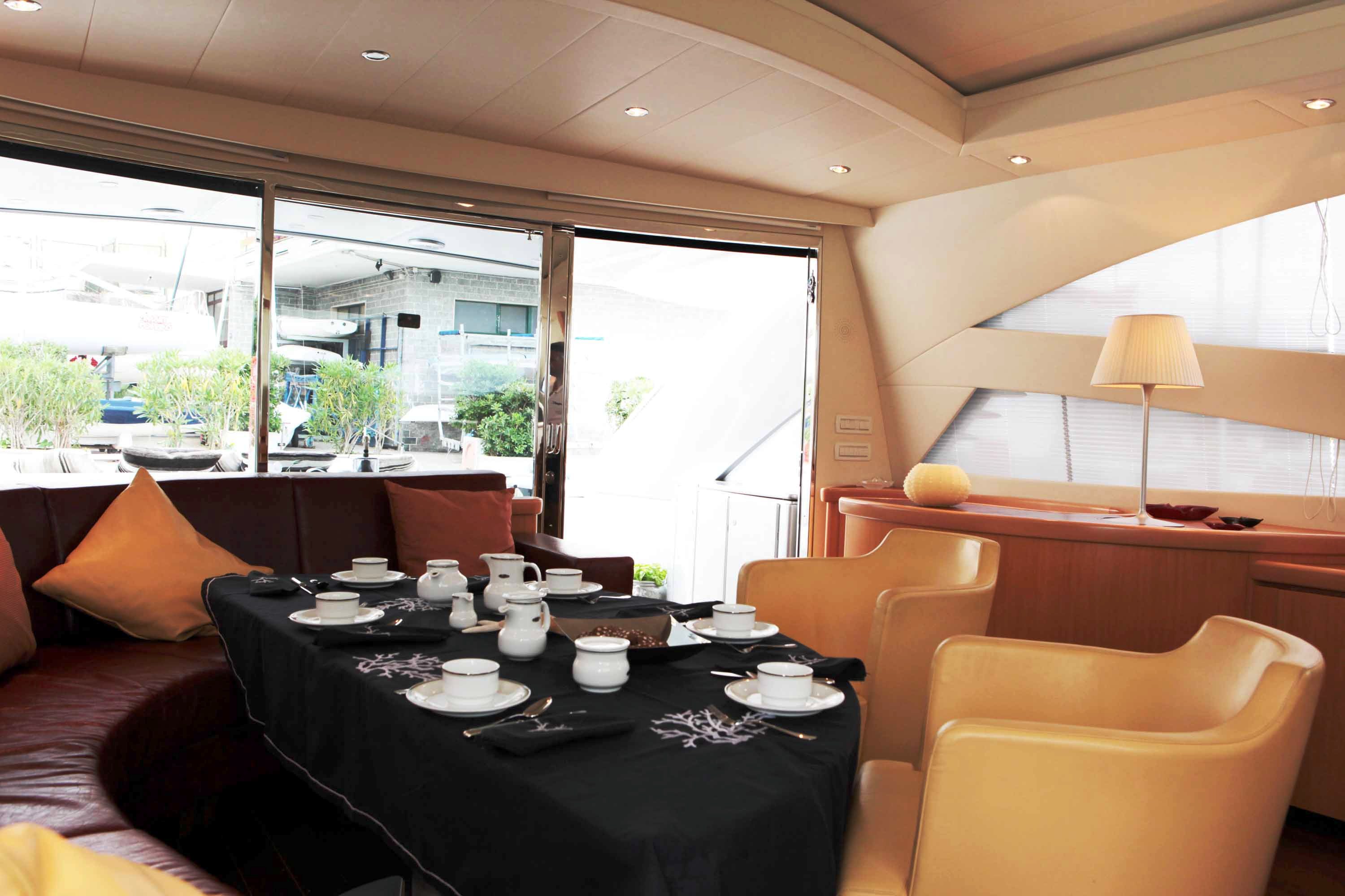 There is a convertible table to accommodate eight guests dining comfortably. The salon has a retractable Plasma TV screen and Dolby Surround, Sky and DVD. Motor yacht FIREFLY is also features fine dining settings and glass wear to complete the luxury experience.