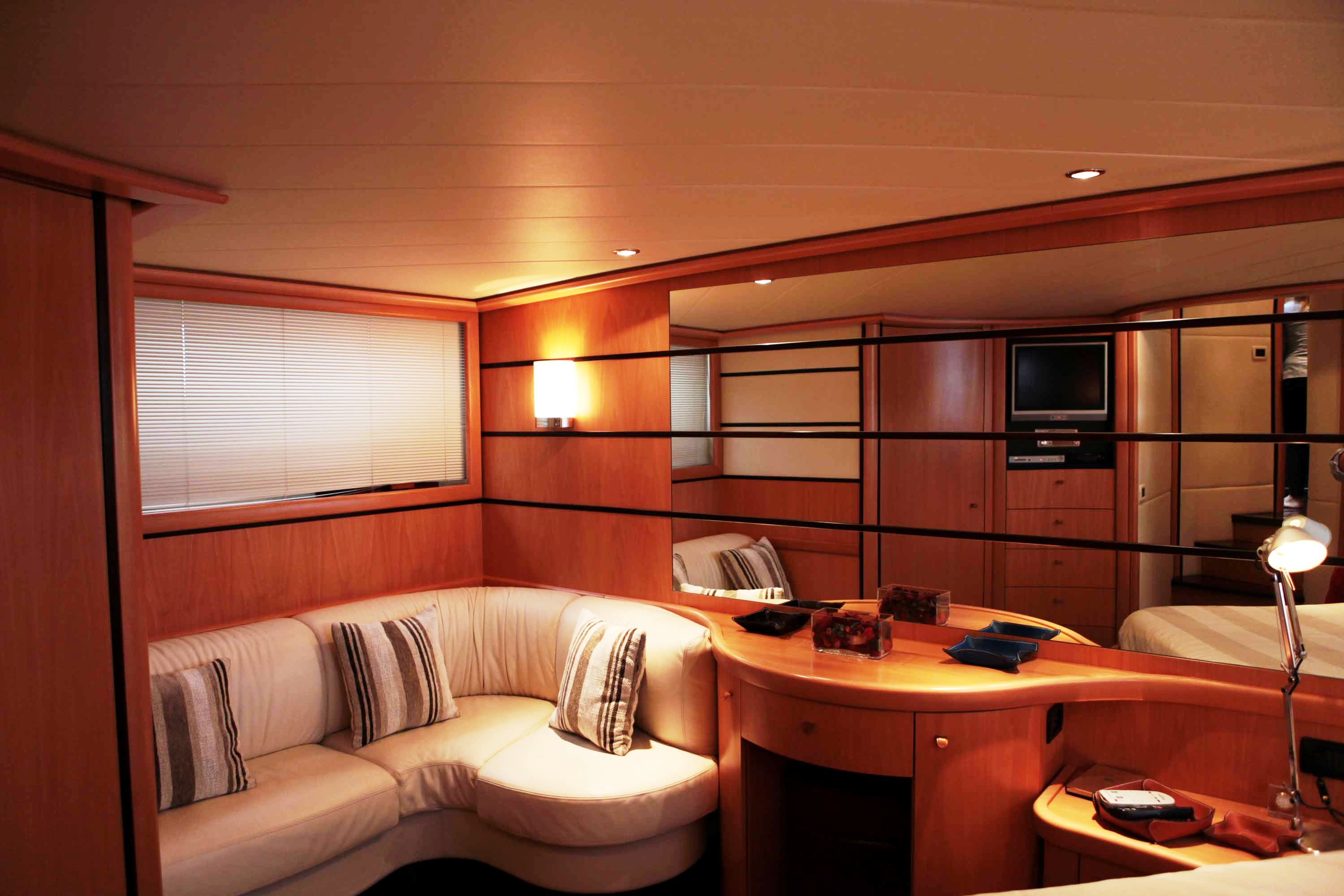 Pershing Motor yacht FIREFLY is able to accommodate up to 8 guests in 4 cabins. Her master stateroom has king size bed and the cabin is tastefully decorated with cherry wood furniture, cabinets, drawers, fridge, bar, and a lovely sofa, ensuite bathroom with shower. There is also a Plasma TV, stereo, DVD, Sky, air conditioning, safe and fridge.