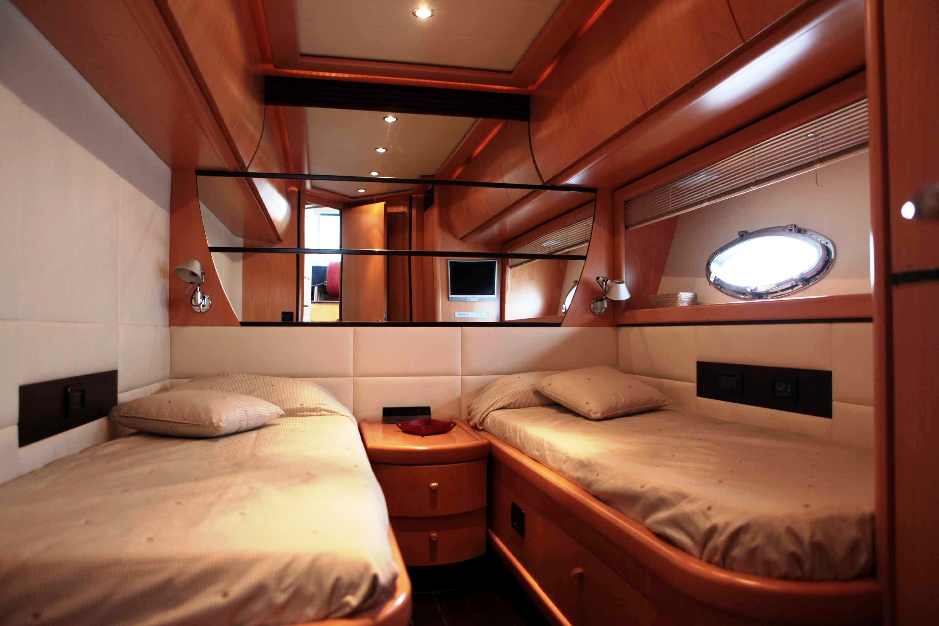 Pershing Motor yacht FIREFLY is able to accommodate up to 8 guests in 4 cabins. Her master stateroom has king size bed and the cabin is tastefully decorated with cherry wood furniture, cabinets, drawers, fridge, bar, and a lovely sofa, ensuite bathroom with shower. There is also a Plasma TV, stereo, DVD, Sky, air conditioning, safe and fridge.