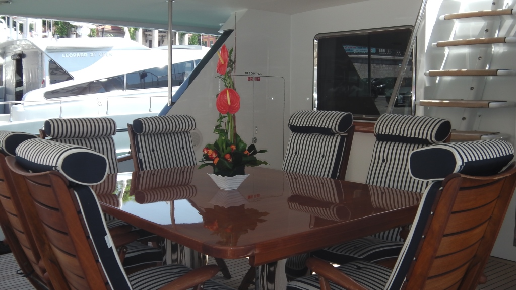 There is a spacious Aft deck with a teak table and seating for 8, steps up to a vast Fly bridge and a fabulous sun deck with an electronic sunshade and a further outdoor dining area with a BBQ and fridge.