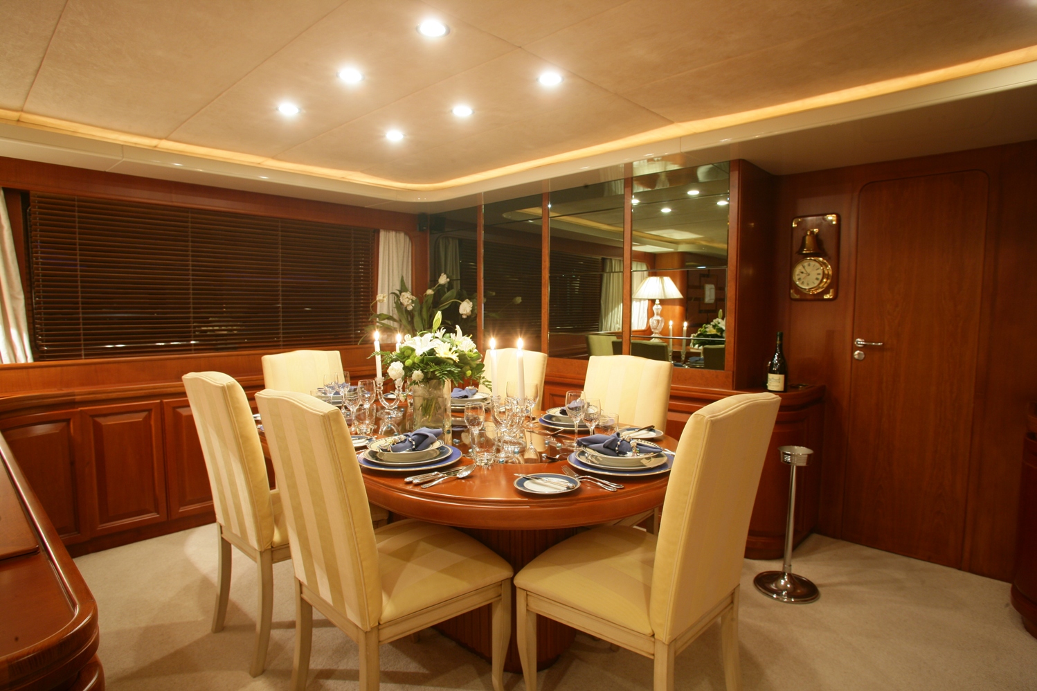 There is a spacious Aft deck with a teak table and seating for 8, steps up to a vast Fly bridge and a fabulous sun deck with an electronic sunshade and a further outdoor dining area with a BBQ and fridge.