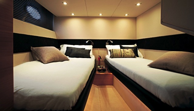 The accommodation area is also located below deck and includes 3 cabins however one of these is reserved for the Captain so a maximum of 4 charter guests can be accommodated either 2 doubles or 1 double and 1 twin cabin.