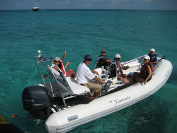 Charter yacht Yianola has a spacious top deck is great for lounging or entertaining while watching the kids as they are pulled on the inflatable tube or wakeboarding and knee boarding in the surf.