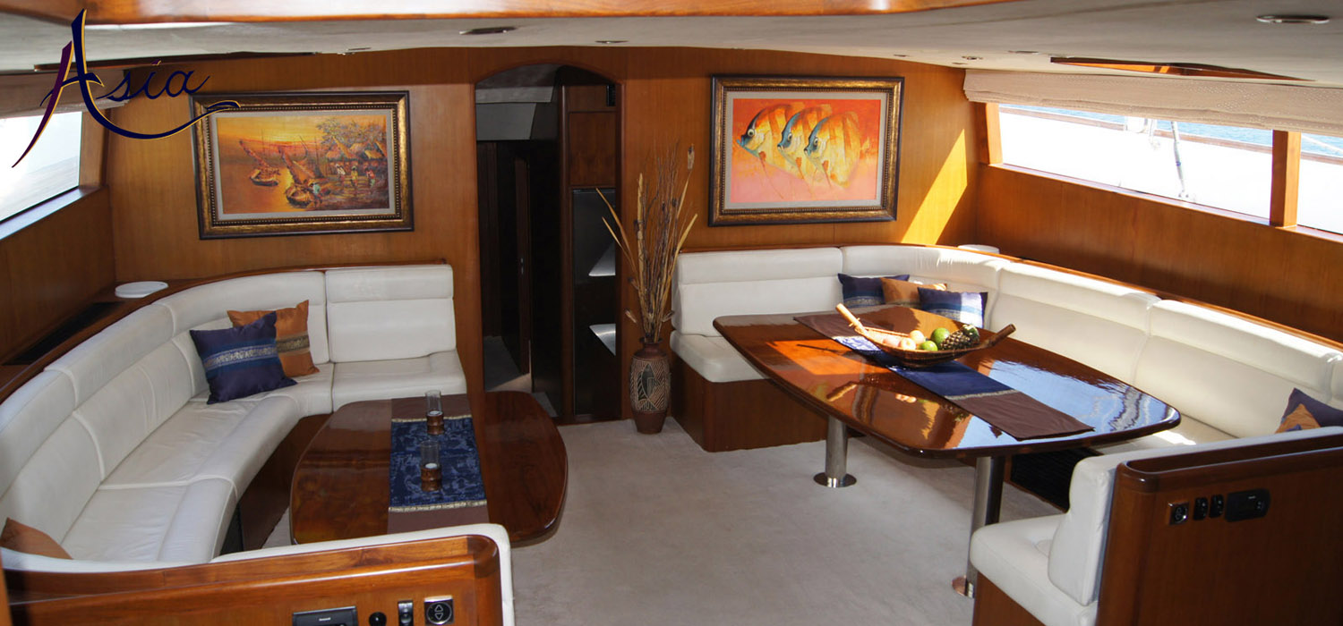 The yacht is luxuriously finished in Burmese teak combining luxurious leather sofas in the saloon with practical sunbrella sofas in the pilothouse and cockpit. The soft furnishings, artwork and accessories throughout have an Asian flair to suit the theme of this beautifully decorated yacht.