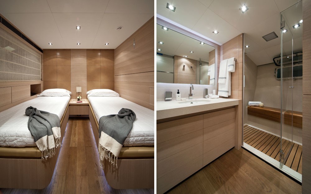 Motor yacht APACHE II has 5 cabins comprised of a Master cabin, 2 double bedded cabins and 2 twin cabins with a Pullman bunk in each.