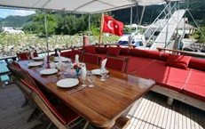 Her huge aft deck has oversized sun pads at the aft and a large table under the shade for al fresco dining during the day or in the warm evenings. There is further large sun pads located on the huge deck forward.