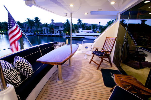 The fly bridge level of motor yacht SHOW BOAT is spacious with L shaped couches lining the port and starboard side aft. Forward of the couches is a fully equipped bar with stool seating. All the way forward on the fly bridge is the control station where you can watch your captain at work.