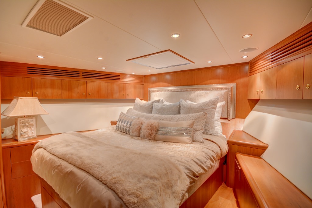 A marble foyer on the starboard side leads to the country style galley, followed by private access to the full beam, forward VIP cabin. Below decks, there are a further 4 guest cabins.