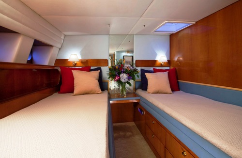 Sailing yacht APACHE is able to accommodate up to 8 guests in 4 cabins, including a Master cabin with a queen size bed, two Twin cabins and a Guest cabin with a double bed and an ‘upper’ single bed. All cabins have ensuite head and showers as well as ample storage with 4 drawers and one hanging locker in each room.