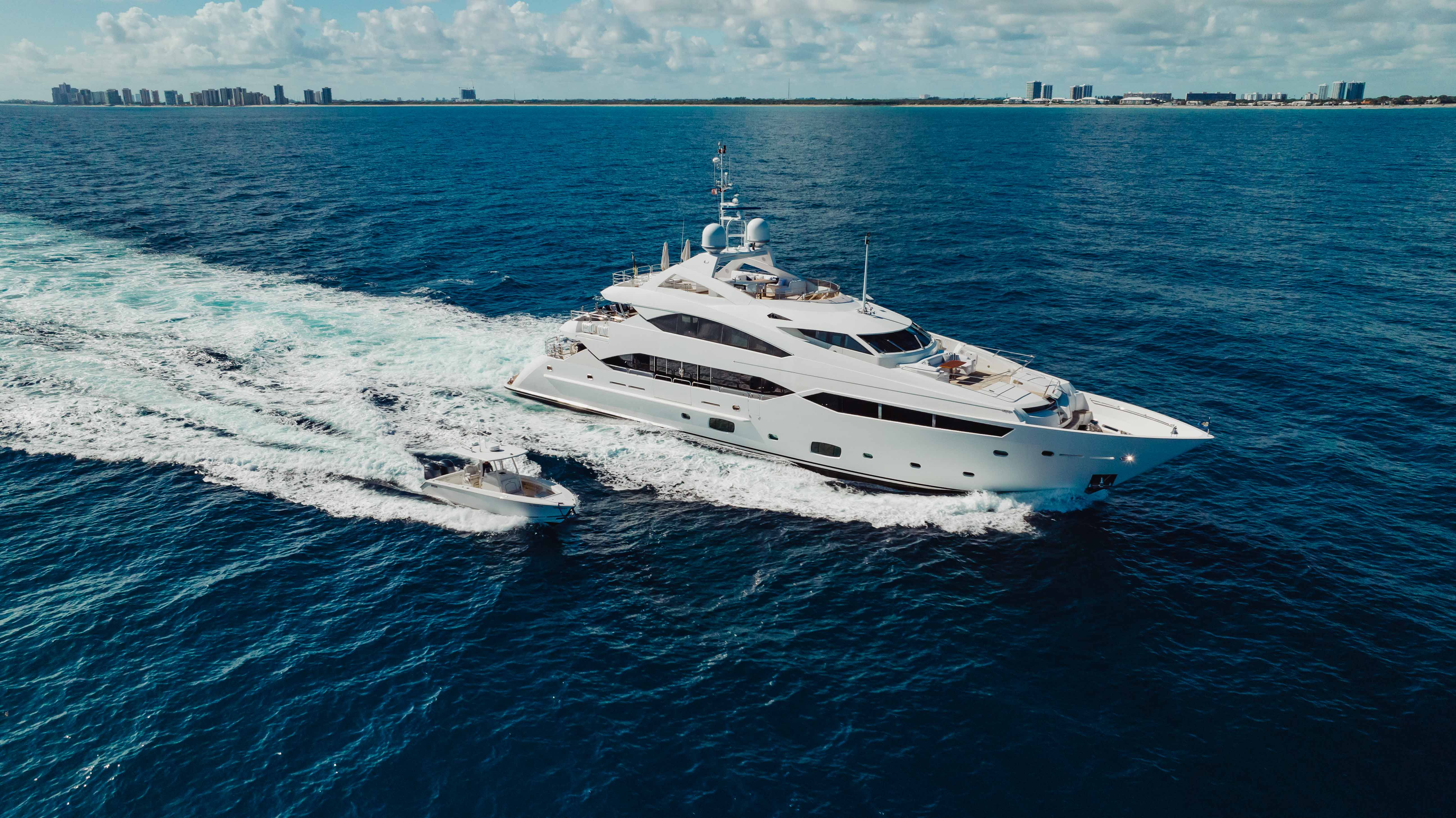The stern of the Sunseeker 40 Metre MotorYacht ABOUT TIME has an increased rake which gives an impressive streamlined profile and features a sharp, ocean-going bow. Passengers enjoy steps which curve inwards on each side of the hydraulic central bathing platform, providing a true superyacht feel when boarding.