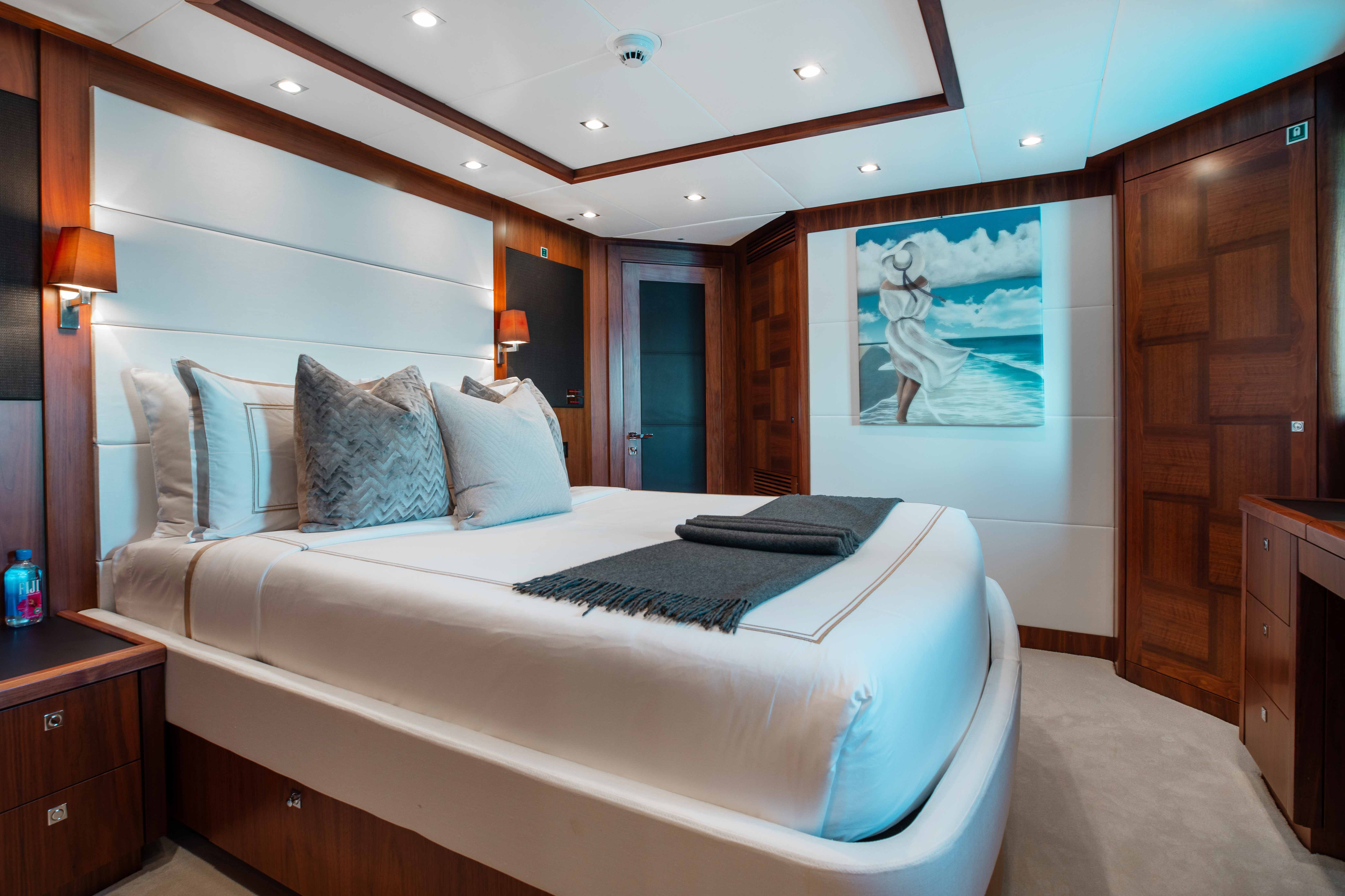 The interior of the Sunseeker 40 luxury yacht ABOUT TIME spreads across three decks and offers the option of balconies on either side of the main deck saloon, and on one side of the master stateroom - opening up magnificent seascapes and bringing in more natural light.