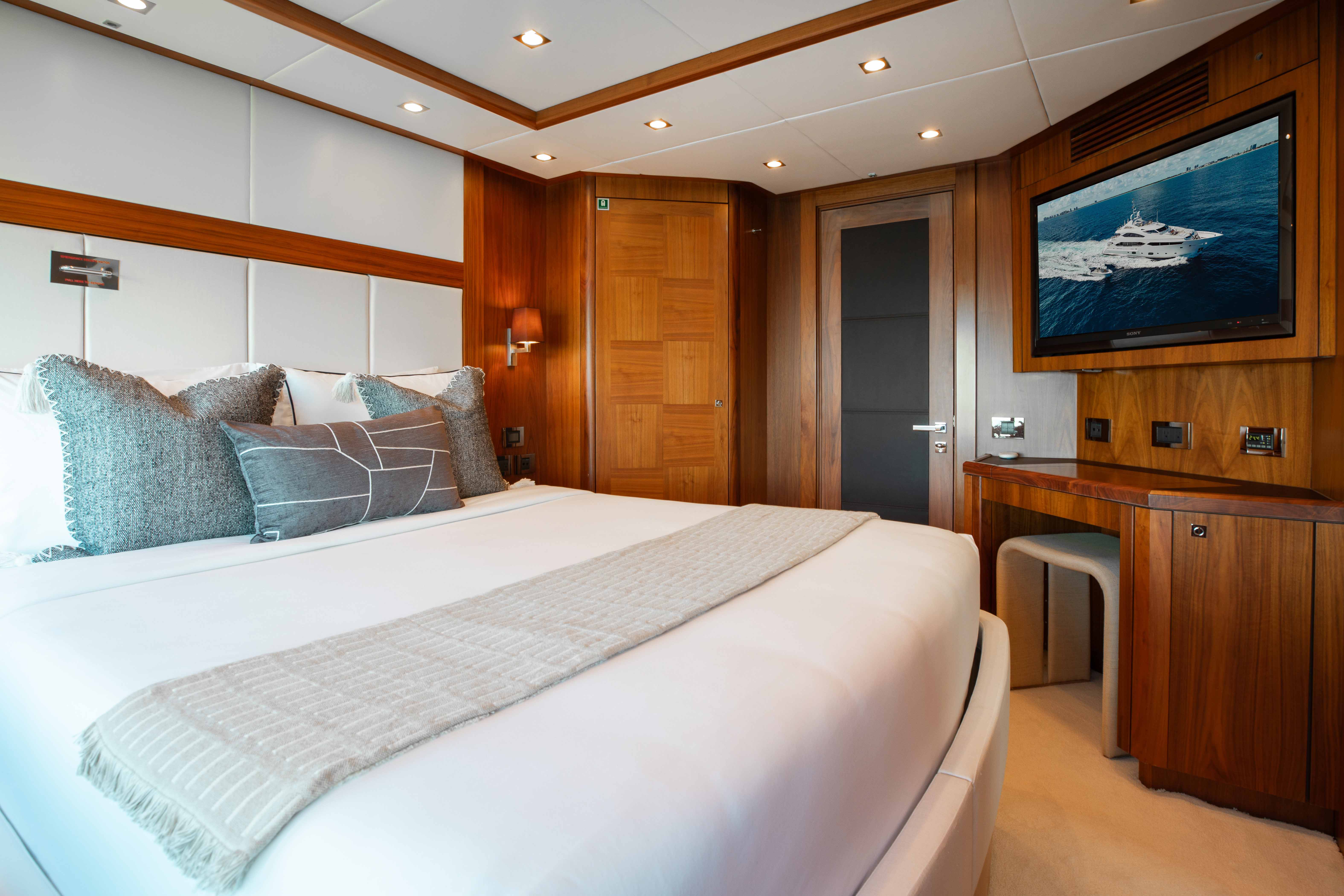The interior of the Sunseeker 40 luxury yacht ABOUT TIME spreads across three decks and offers the option of balconies on either side of the main deck saloon, and on one side of the master stateroom - opening up magnificent seascapes and bringing in more natural light.