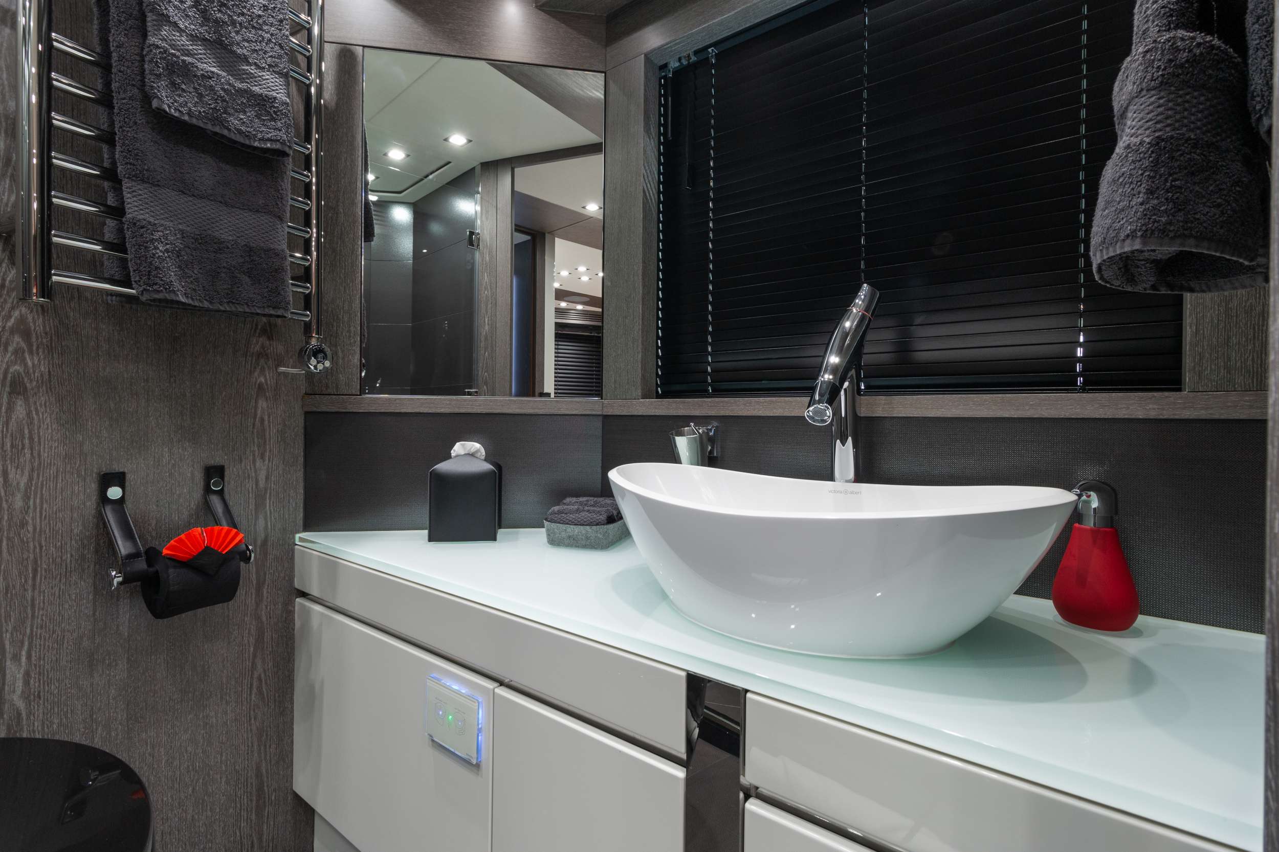 The stern of the Sunseeker 40 Metre MotorYacht ABOUT TIME has an increased rake which gives an impressive streamlined profile and features a sharp, ocean-going bow. Passengers enjoy steps which curve inwards on each side of the hydraulic central bathing platform, providing a true superyacht feel when boarding.