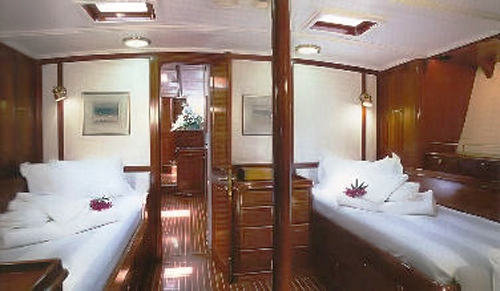 There are port and starboard guest cabins, each with two single beds and adjoining bathrooms with showers. Two additional bunks are provided in the main salon, enclosed by a privacy curtain. The owner’s cabin located midships offers two beds; one extends to a full queen sized bed if required.