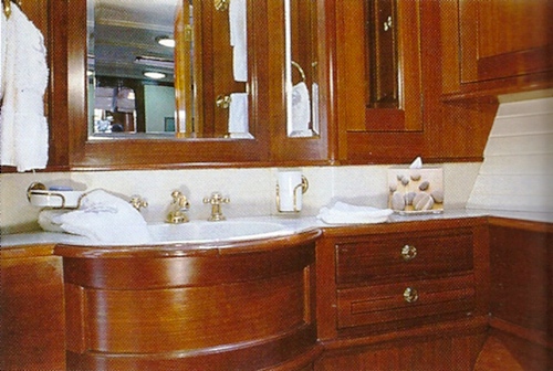 The owner's cabin also offers a comfortable settee with a fold down work desk and a well appointed bath room with shower stall.