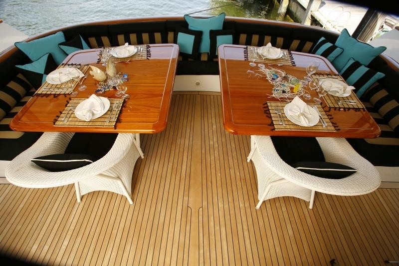 Sovereign motor yacht OCEAN CLUB boasts great outdoor areas including a large aft deck with a U shaped settee with 2 tables.