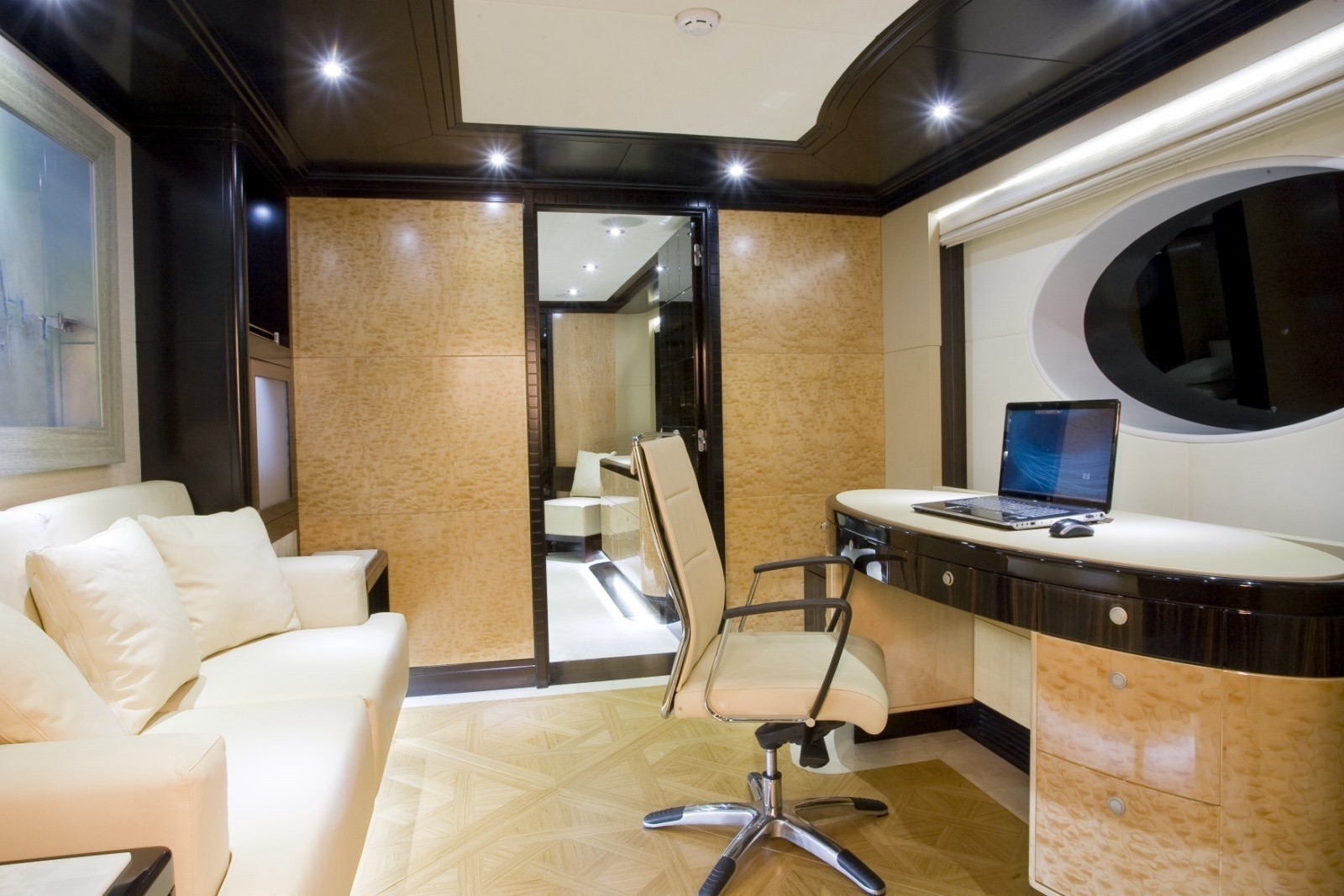 Adjoining the master suite there is an Owner’s office with writing table and sofa. There are two VIP Cabins featuring a Sofa and dressing table, a full height wardrobe closet and ensuites with step showers. There are also two twin cabins with twin beds and an ensuite with a sky shower with a glass door.