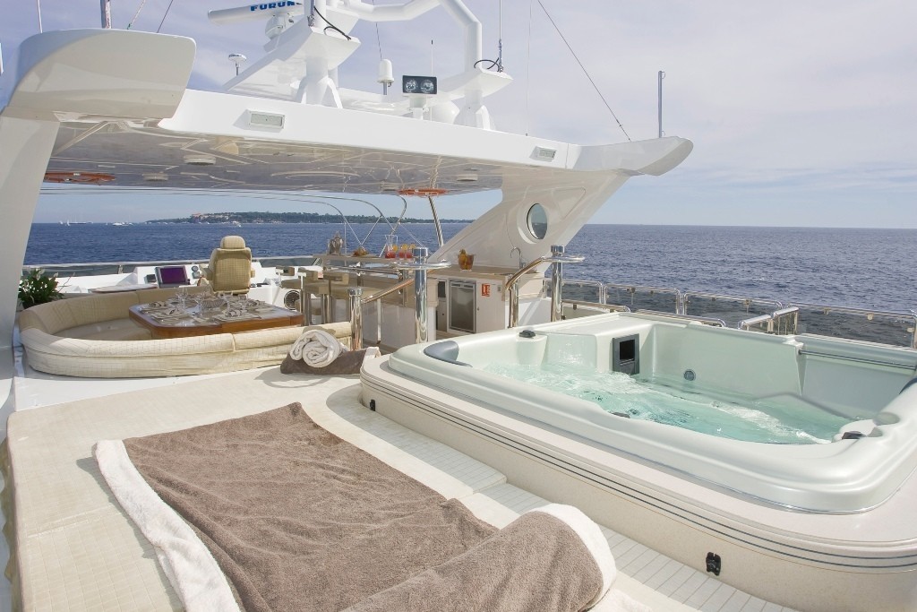 An automatic retractable sunshade and al Fresco dining, a six person Spa Pool on the sundeck offering 360 degree views and 2 sets of outdoor wet bars with barbecues are just some of the impressive features superyacht Grenadines III offers.