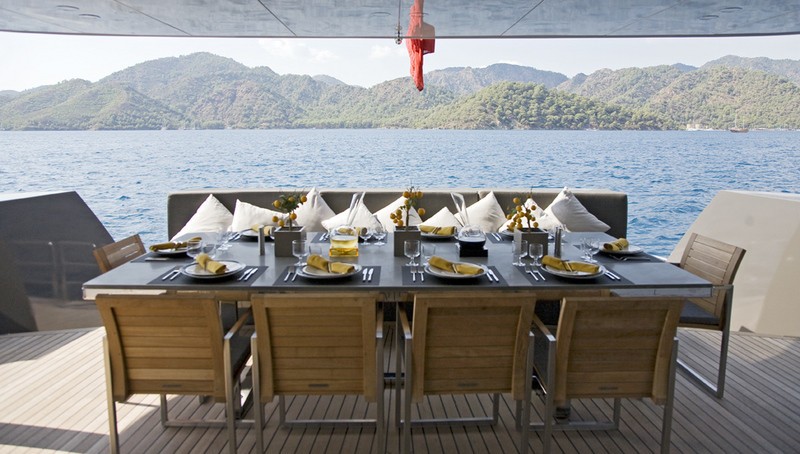 A small bar area allows for quick food and cold drink service from the refrigerator. M/Y MAISHA’s aft deck contains a gray marble and chrome dining table which can seat 12 guests, wooden chairs with slate gray cushions, and a large slate gray couch.