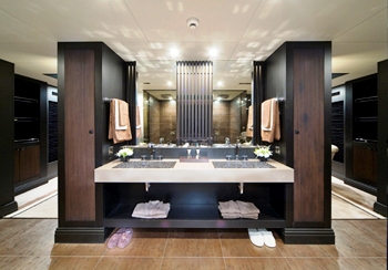 This colour scheme of orange and black continues in the ensuite and is elegant with fixtures imported from Italy. The twin cabin has a Black and White theme with ivory carpet and black furniture. The contrast is striking with black window blinds and doors, black beds and headboards, and a black chair.