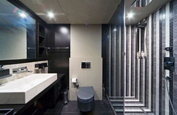 This colour scheme of orange and black continues in the ensuite and is elegant with fixtures imported from Italy. The twin cabin has a Black and White theme with ivory carpet and black furniture. The contrast is striking with black window blinds and doors, black beds and headboards, and a black chair.