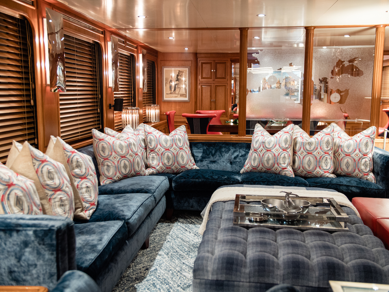 Inside, the forward formal dining area is a blend of classic and modern styles, providing plush seating in cerise leather and blue fabrics for up to six guests around a grand oval table. Large windows on both sides allow for ...