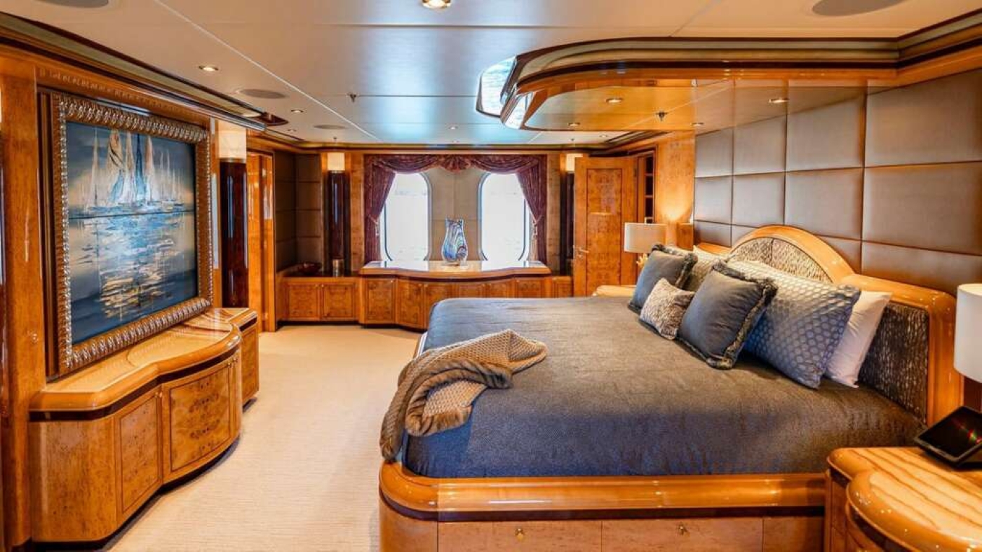 Additionally, the master stateroom is on the main deck, spreading a full beam of the yacht forward and featuring a private study, large marble ensuite with shower and a Jacuzzi tub. The master stateroom boasts a further private ensuite with a tub.