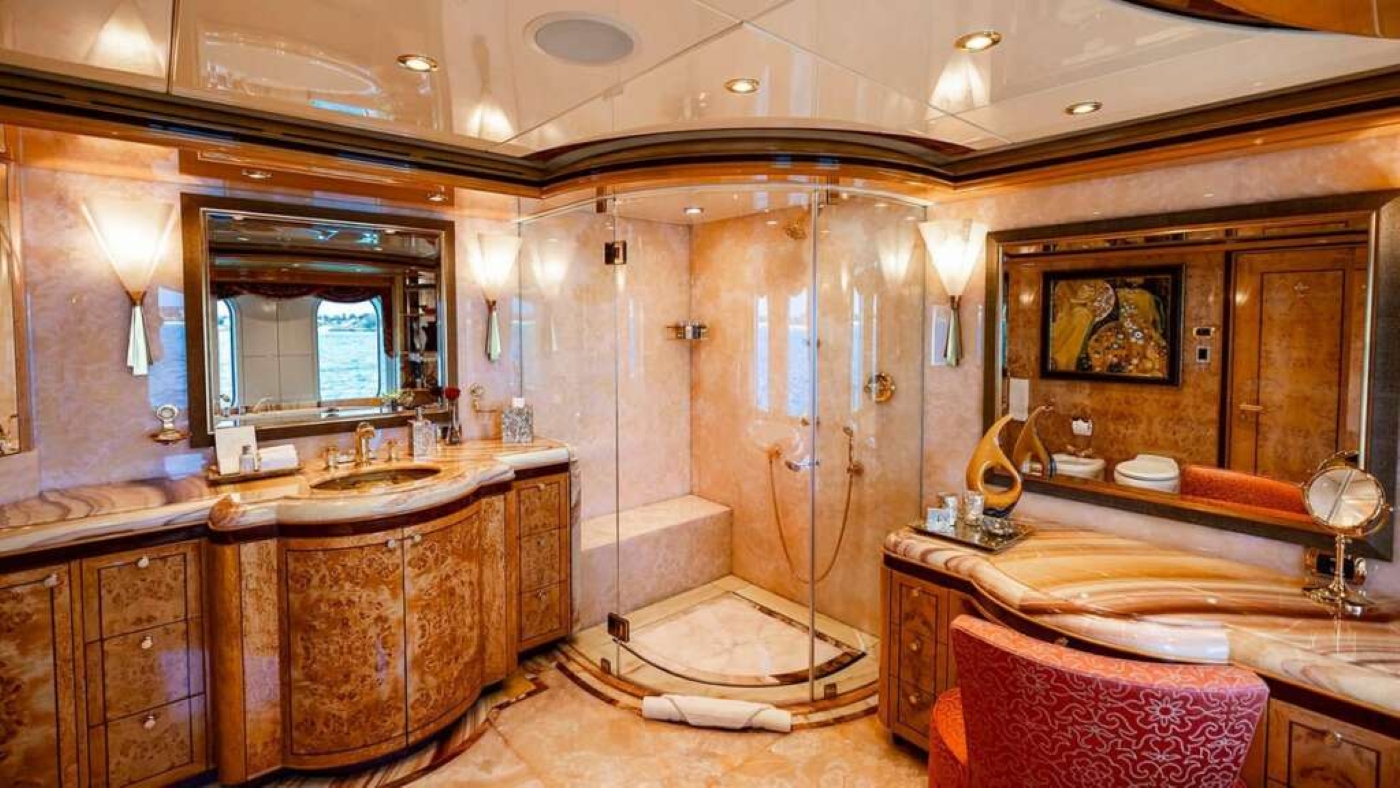 The master stateroom is full beam of the yacht on the main deck and forward, featuring a king size bed, sofa, private study and his and hers bathrooms, one with tub and shower, the other with tub. The master cabins large windows provide ample natural light.