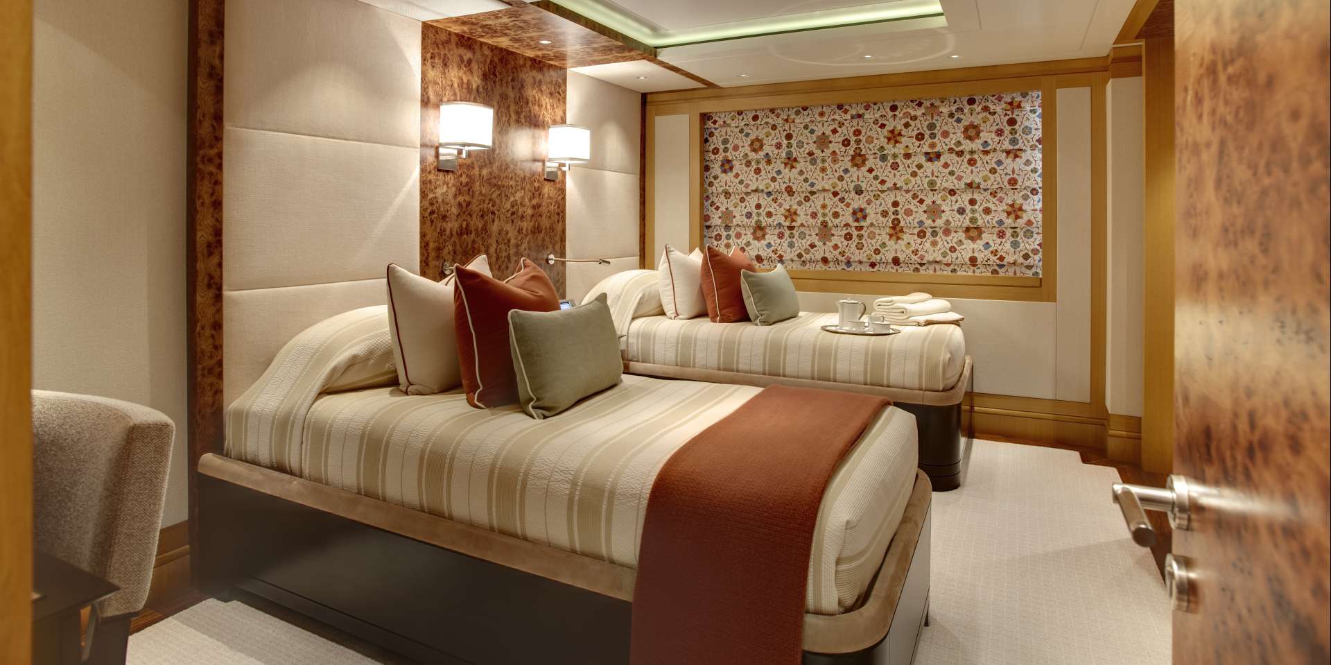 The yacht interior is in a chic, modern, Scandinavian style with a stunning blend of marble surfaces, teak and macassar ebony furniture and rosewood ...