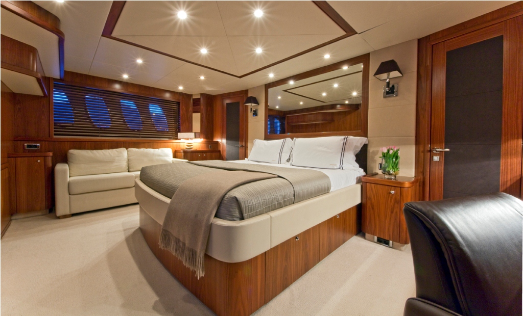 Sunseeker motor yacht DONIZETTI is able to sleep up to 10 guests. On the lower level, there is a large master cabin with king size bed and walk in wardrobe and a generous shower room.