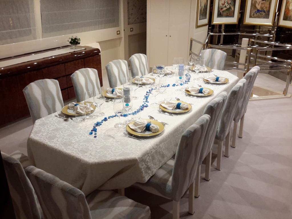 The main salon is spacious with a seating area aft, a large U-shaped sofa in the central salon where you can watch the plasma TV and a dining area for 12 guests further forward.