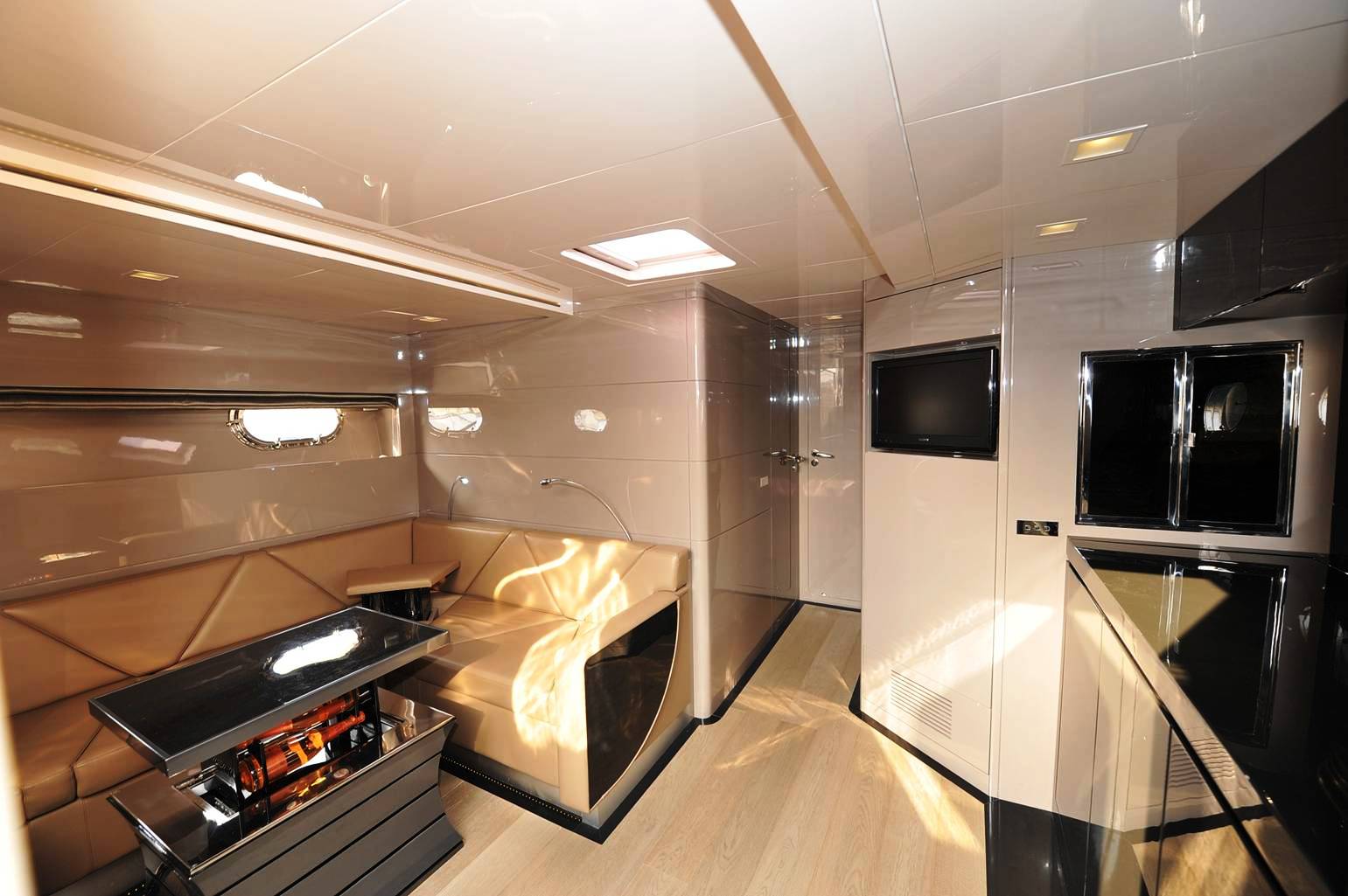 Motor yacht GUSH’s salon has a u shaped couch with table to port and the Galley bench to starboard. Motor yacht GUSH is able to sleep 4 guests in 2 cabins including a master cabin with a King sized bed and a twin cabin with single beds.