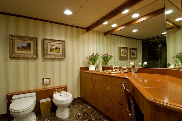 The Skylounge is accessed from the main deck by a curved teak paneled stairwell. It is large with plenty of good natural lighting from 3 large windows on each side of the yacht and features a 42" Sony flatscreen TV and stereo/DVD system to enjoy. Double glass doors give access the top deck.