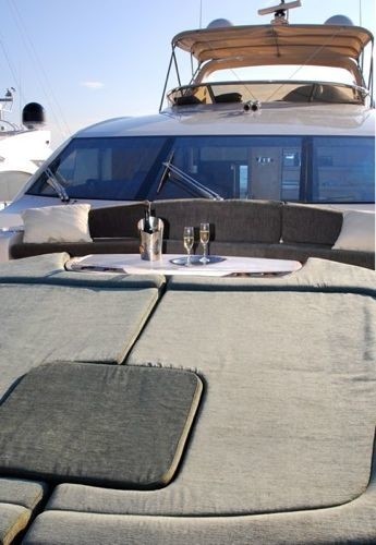 The yachts flybridge boasts areas for sunbathing, enjoying a Spa Pool and dining while taking in the breathtaking views.