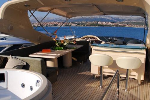 The yachts flybridge boasts areas for sunbathing, enjoying a Spa Pool and dining while taking in the breathtaking views.