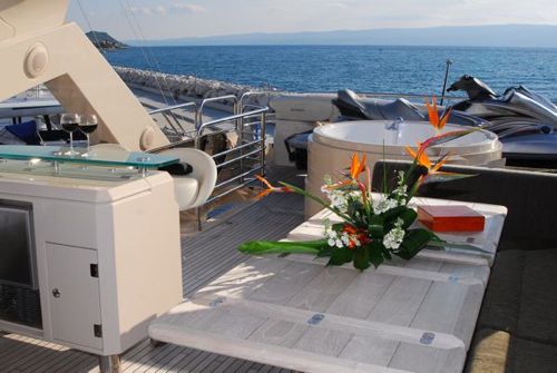 The yachts flybridge boasts areas for sunbathing, enjoying a Spa Pool and dining while taking in the breathtaking views.