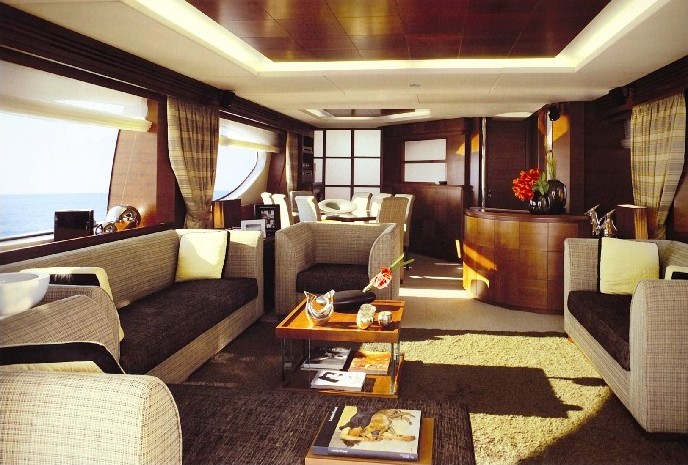 Motor yacht Tropicana has a tasteful main salon and adjoining dining area featuring neutral elegant décor. The interior of the yacht received plenty of natural light thanks to the large windows on each side of the yacht.