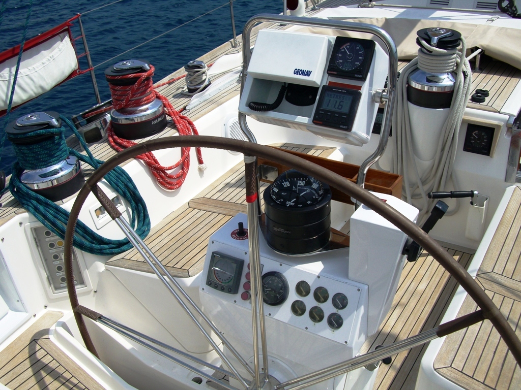 At the aft starboard end of the main saloon is the navigation station while to port is the galley.