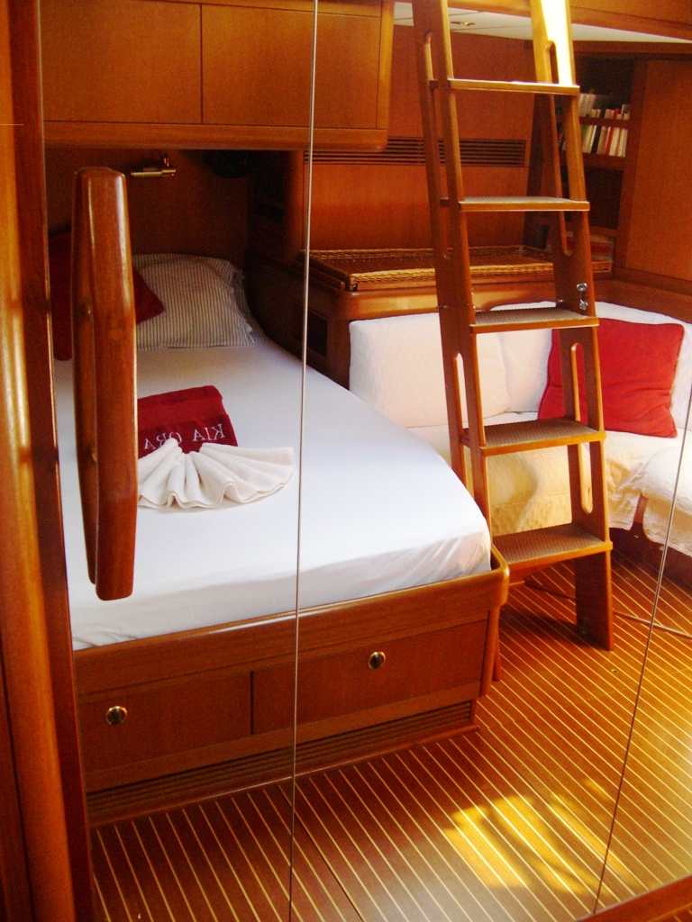 Sailing yacht KIA ORA III can accommodate up to 6 guests in 4 luxurious cabins, all with en suite facilities. Her cabin configuration consists of: aft owner’s cabin with a spacious center double bed with on either side rounded ...