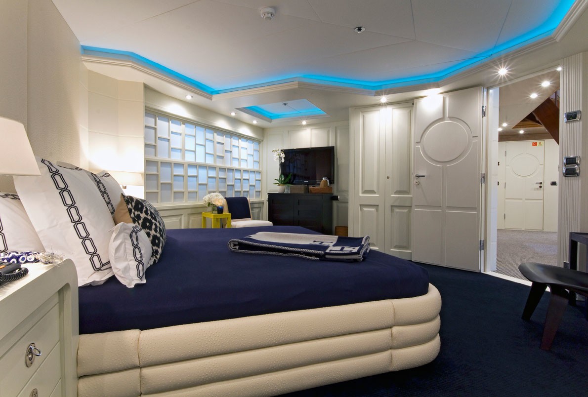 The Master cabin has His and hers facilities with dressing areas and generous wardrobe space. The VIP stateroom is located on the upper deck and is equipped with generous en-suite bathroom and dressing room. There is also a Staff twin cabin on the upper deck.