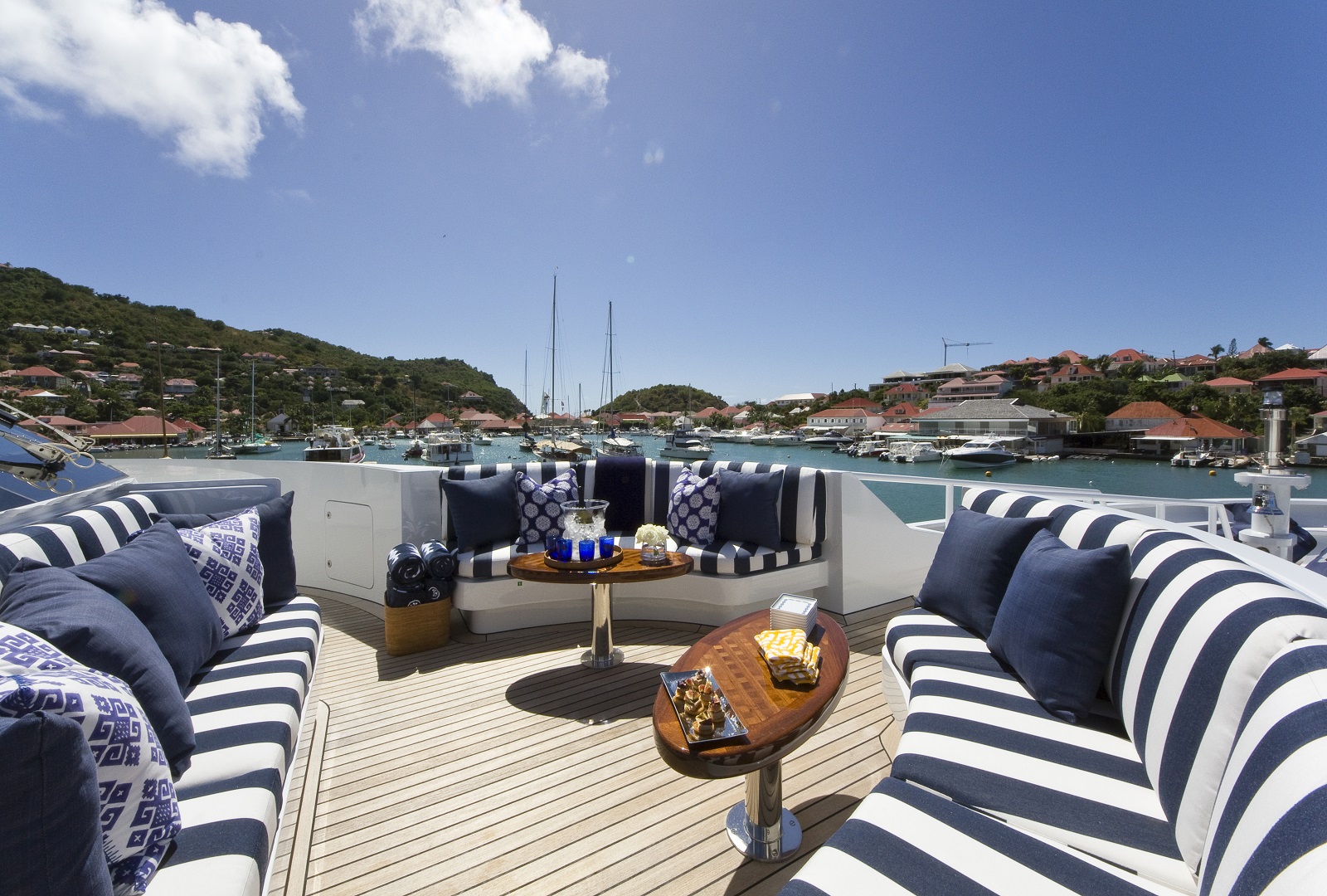 Her exterior is equally impressive with a huge sun deck with a areas to dine for 16 guests, sheltered by sculpted sail awnings, soak in the Spa Pool or sunbathe.