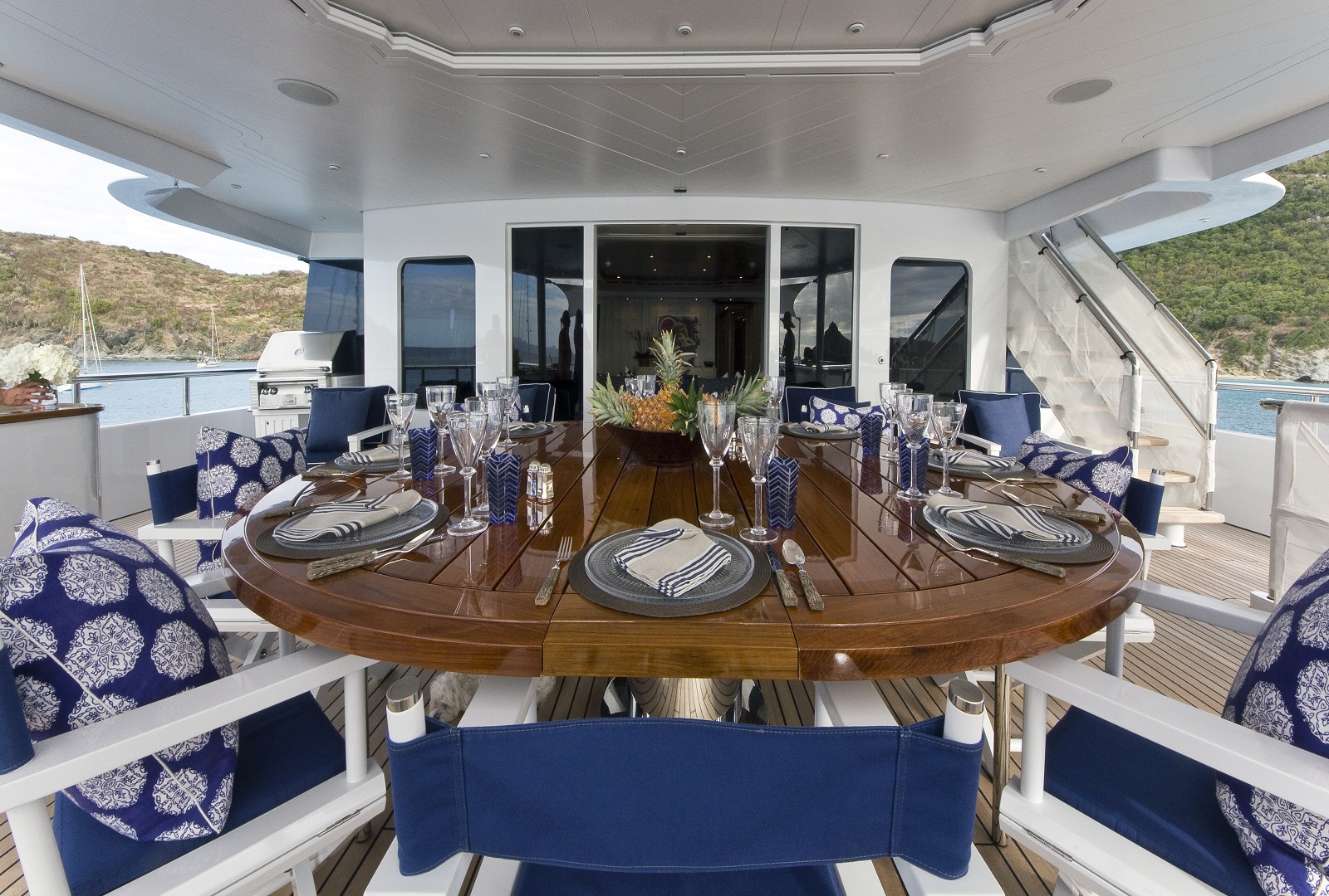 Her exterior is equally impressive with a huge sun deck with a areas to dine for 16 guests, sheltered by sculpted sail awnings, soak in the Spa Pool or sunbathe.