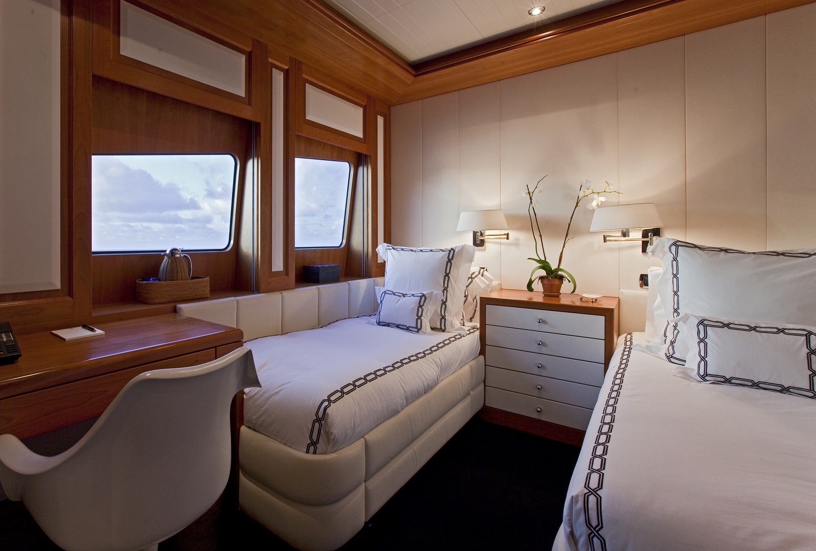 The Master cabin has His and hers facilities with dressing areas and generous wardrobe space. The VIP stateroom is located on the upper deck and is equipped with generous en-suite bathroom and dressing room. There is also a Staff twin cabin on the upper deck.