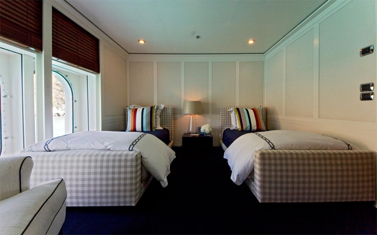 The Master cabin has His and hers facilities with dressing areas and generous wardrobe space. The VIP stateroom is located on the upper deck and is equipped with generous en-suite bathroom and dressing room. There is also a Staff twin cabin on the upper deck.