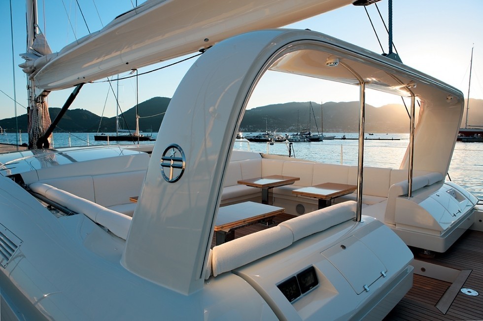 The cockpit and brightly lit deck-saloon of superyacht P2 are inviting.