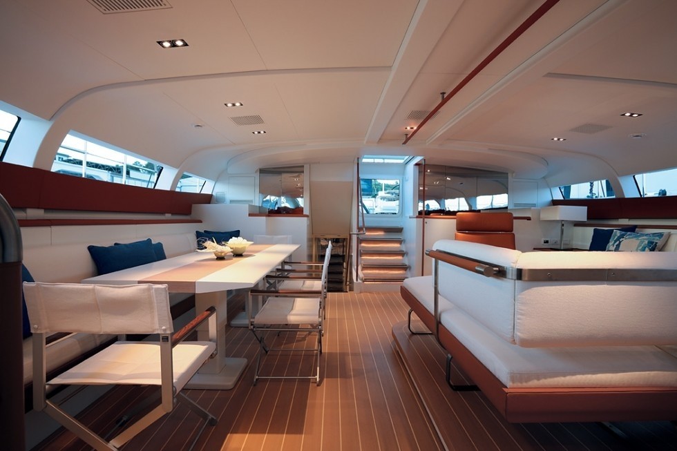 38m S/Y P2 features a comfortable and spacious lay-out which was inspired by the lightness of the hull and rig resulting in a design in which the furniture appears to be weightlessly suspended in the air.