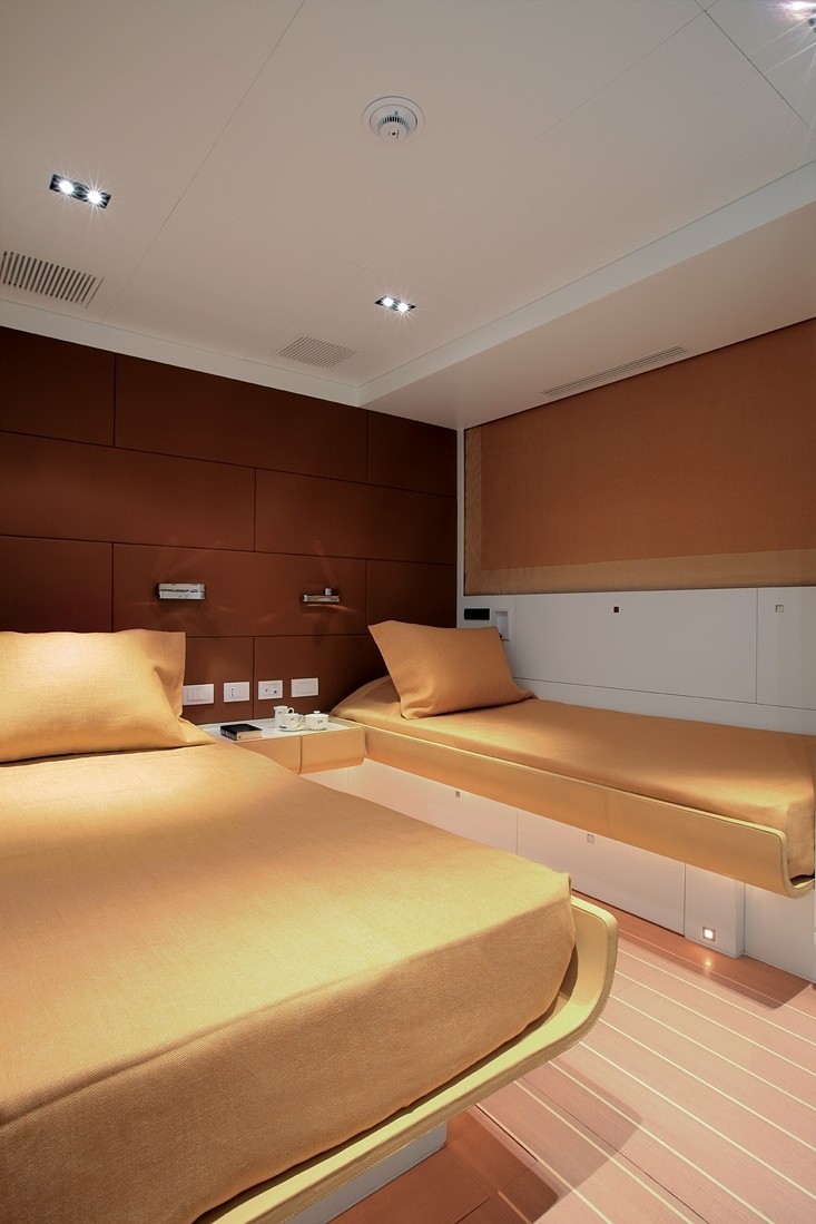 One guest cabin is located to port forward of the Master cabin and can accommodate up to 4 guests in 3 twin beds and an additional pullman berth, while the second cabin can accommodate 2 guests, or 3 if the additional pullman berth is used, is also located to port further forward, beyond the central engine room.